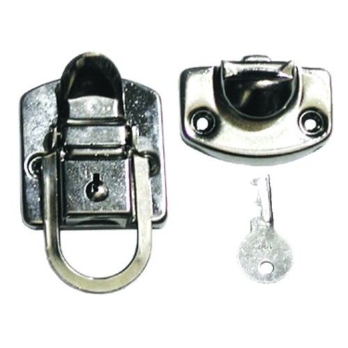 Chrome plated latch with locking key. Two of these go on the front of each accessory trunk.