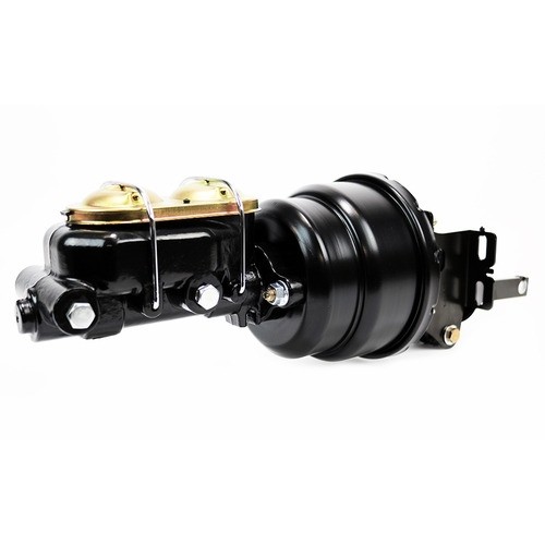 Includes new booster, new dual reservoir cast iron master cylinder with firewall brackets and pre-calibrated booster pin. NOTE: Boosters require a minimum of 18” of vacuum for proper operation. If wanting power assist on your factory drum brakes a 1” b