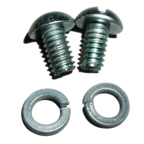 A pair of special round head screws with lock washers to bolt the oval style starter rod cover to the firewall.
