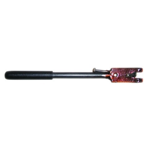 Place the hook over the manifold stud and it acts as a pivot to pry the spring up allowing you to install the keeper.
